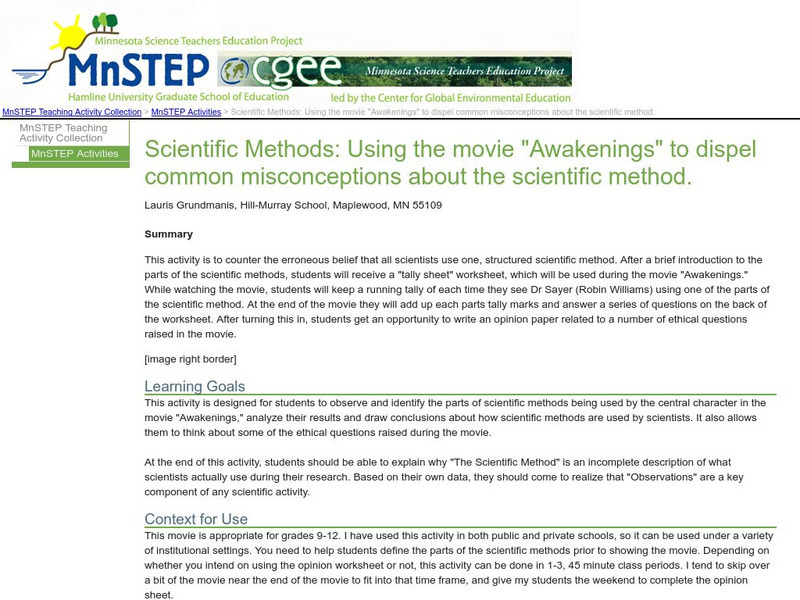 An activity where students watch the movie "Awakenings" starring Robin Williams. The purpose of the lesson is for students to record on a tally sheet each time they notice a step in the scientific method being used. They will become...