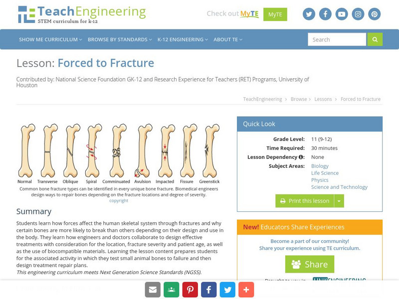 Students learn how forces affect the human skeletal system through fractures, and why certain bones are more likely to break than others depending on their design and use in the body. They learn how engineers and doctors collaborate to...