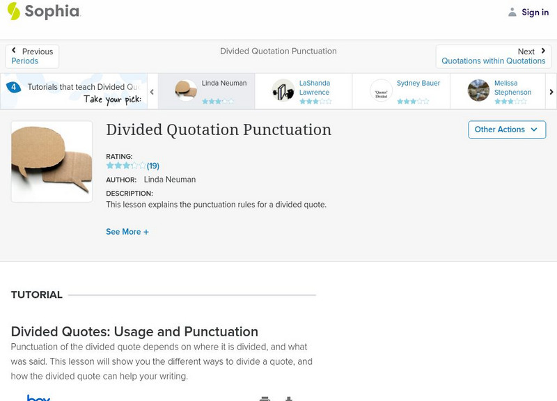 This slideshow lesson focuses on divided (split) quotations and how to punctuate them. It presents four uses of the divided quote, explains how to punctuate each, and provides examples.
