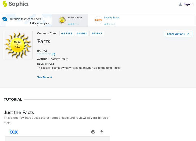 This slideshow lesson focuses on facts; they are true, verifiable, and identical across sources. General facts, commonly accepted, do not need citations; specific facts: statistics, expert testimony, and anecdote do require citation.
