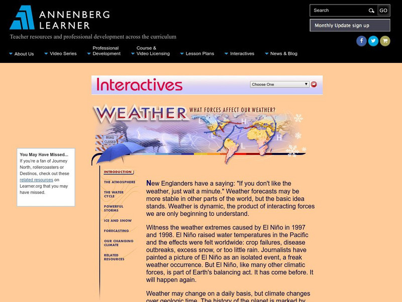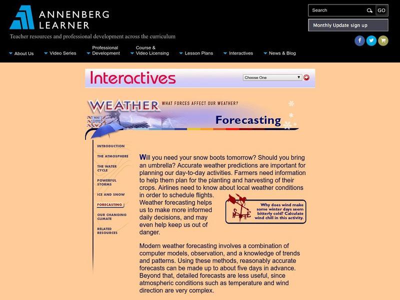 A great starting point for learning about the weather and for finding help starting your own investigation of what affects the weather. Site is organized into the following sections: "The Atmosphere," "The Water Cycle," "Powerful...