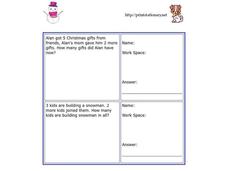 In this Christmas word problems worksheet, students read and solve 1-digit addition problems. In this short answer worksheet, students write process and answers to two problems.