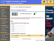 In this simple past tense worksheet, students write the past tense forms of irregular verbs, complete tables and sentences in simple past and fill in blanks using 'was' or 'were.' Answers may be submitted online. ESL appropriate but not...