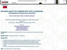 Students examine nontraditional career choices for their gender. In this career education lesson, students participate in a discussion of jobs and vocations as the teacher models uniforms or hats associated with different jobs. They talk...