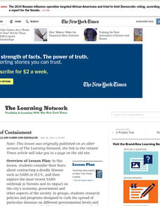 Students examine SARS outbreak in Toronto and its impact on the economy, government and society. They, in groups, research policies and programs designed to curb the spread of diseases, and create presentations assessing their...