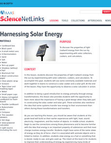 Students discover the properties of light (radiant) energy from the sun by experimenting with solar collectors, cookers, and calculators. After a lecture/demo, students create their own solar collectors and test their efficiency.