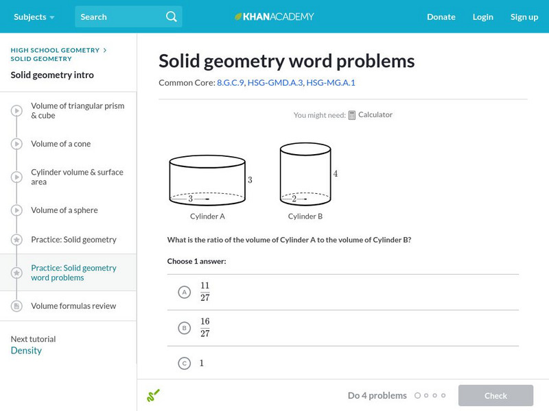 Solve problems concerning real-world situations with the volumes of cones, cylinders, and spheres. Students receive immediate feedback and have the opportunity to try questions repeatedly, watch a video or receive hints.