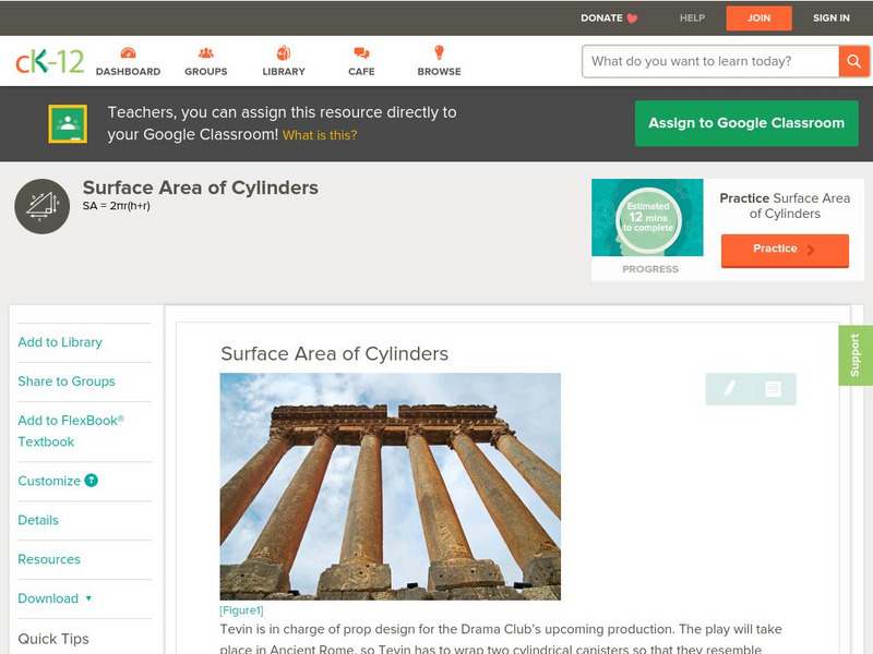 [Free Registration/Login may be required to access all resource tools.] Use a formula and given information to find the surface area of different cylinders.