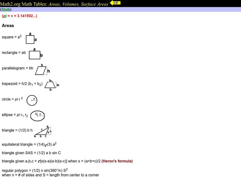 This site gives formulas for the area, volume, and surface area of various shapes.