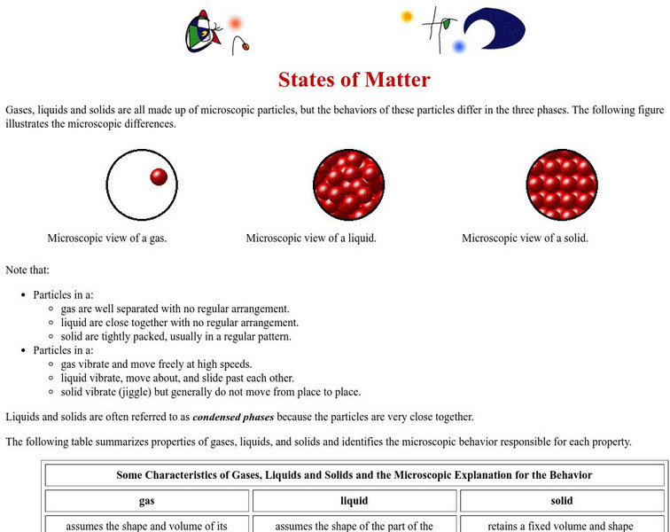 This site has a brief description of the differences in particles in a gas, liquid, and solid. Animated microscopic pictures demonstrate the molecular movement in each state. Information is then summarized in an easy-to-read chart.