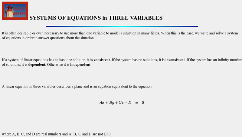 This Purplemath lesson provides formulas, equations, graphs and explanations of systems of equations.
