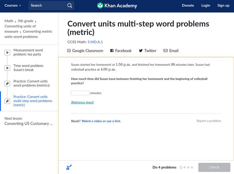 Solve word problems that involve converting between metric measures of distance, volume, and mass, as well as measures of time. Students receive immediate feedback and have the opportunity to try questions repeatedly, watch a video or...