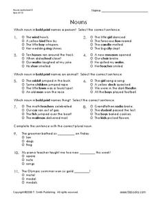 For this nouns worksheet, students practice their grammatical skills as they read 4 sentence sets and select the sentence which names a person or an animal in the bold print. Students also complete 4 sentences with the appropriate noun.