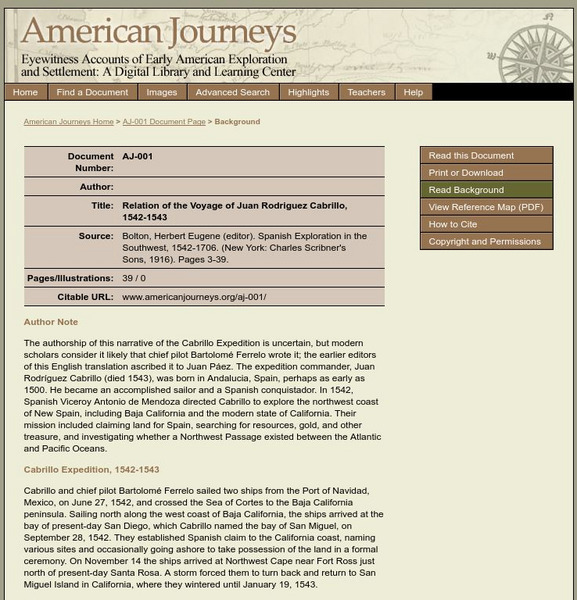 American Journeys: Relation of the Voyage of Juan Rodriguez Cabrillo