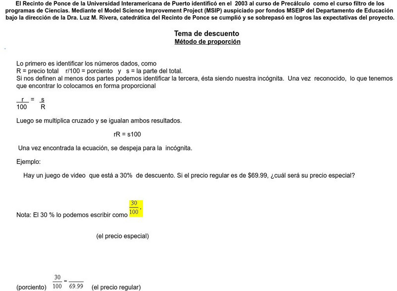 In Spanish. Percent and proportion problems and explanations. Examples are based in the context of discounts. Offers four word problems for students to practice. Solutions are available.