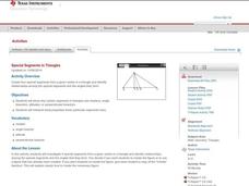 Students investigate special segments in triangles. In this geometry lesson plan, students graph, compare, estimate and predict findings based on their data. They differentiate between similarity and congruence of triangles.