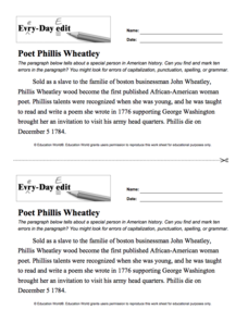 In this everyday editing activity, students correct grammatical mistakes in a short paragraph about Poet Phillis Wheatley. The errors range from capitalization, grammar, spelling, and punctuation.