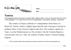 For this everyday editing worksheet, young scholars correct grammatical mistakes in a short paragraph about Tunisia. The errors range from capitalization, punctuation, spelling, grammar.