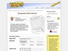 In this social studies instructional activity, students complete a word search. They find words related to Massachusetts (such as names of cities) as well as words about surrounding areas (Atlantic Ocean).