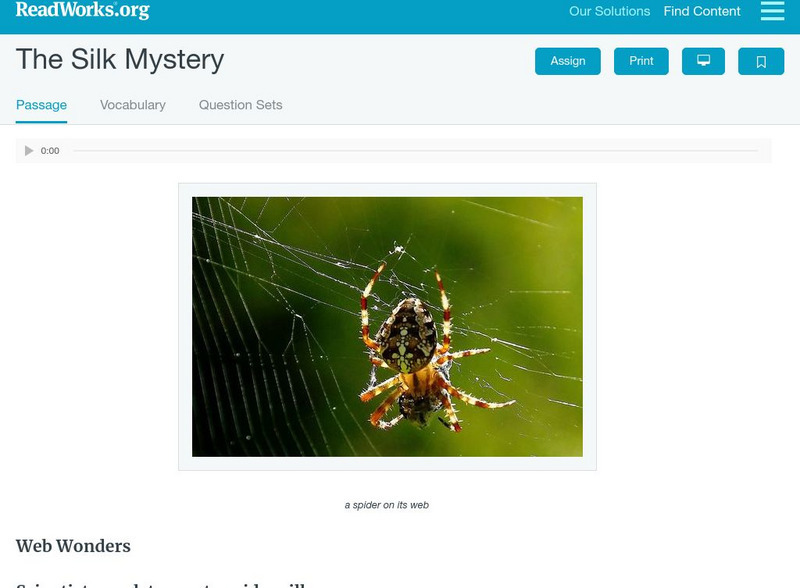 [Free Registration/Login Required] An informational text about scientists' attempts to make spider silk. A question sheet is available to help students build skills in reading comprehension.