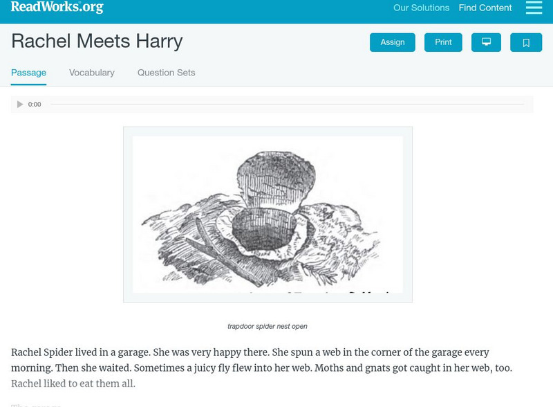 [Free Registration/Login Required] A literary text about a spider named Rachel who gets blown from her web during a storm and meets a trapdoor spider. A question sheet is available to help students build skills in reading comprehension.