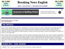 In this Coca Cola worksheet, learners read the article, answer true and false questions, complete synonym matching, complete phrase matching, complete a gap fill, answer short answer questions, answer discussion questions, write, and...