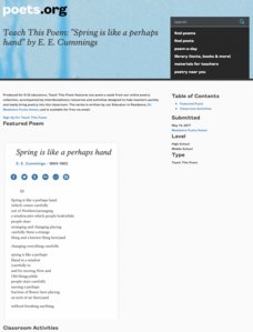 E. E. Cummings' "Spring is like a perhaps hand" offers young scholars an opportunity to try their hands at analyzing a simile. After a warm-up activity and a close reading of the poem, class members discuss what they think the poem is...