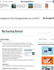 Students examine China's suspected theft of American nuclear secrets, as a springboard for the creation of a research-based, multi-tiered timeline that traces the development, regulation, and use of nuclear weapons from the 1940's to today.