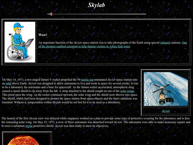 This site has a description of Skylab, its history and what it was used for. Includes glossary, graphics, and printable version.