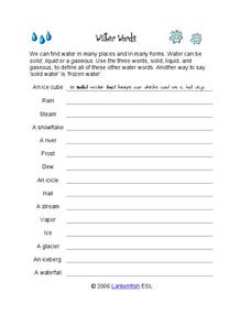 In this defining water words worksheet, students read an example of water in a specific state of matter and names of water forms and use them to create definition sentences. Students write 14 sentences.