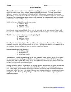 In this matter worksheet, students read a chart that uses water to show the three most common states of matter. Students review the properties of solids. This worksheet has 2 graphic organizers and 8 fill in the blank questions.