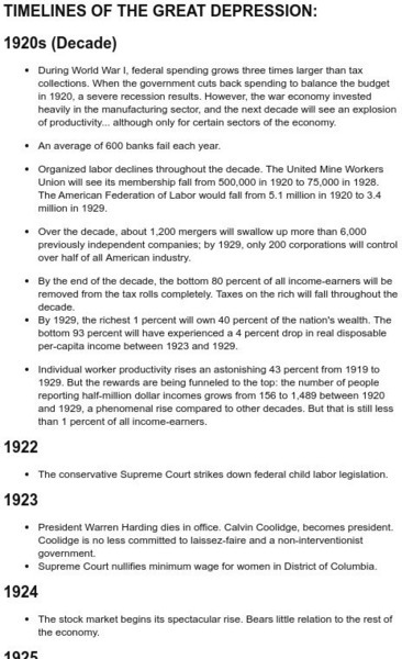 Peruse this timeline of the Great Depression and gather information about this era in United States History. Short, interesting paragraphs summarize U.S. and world events with an emphasis on economic issues.