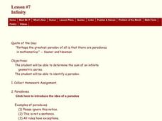 Students determine the sum of an infinite geometric series. In this determining the sum of an infinite geometric series instructional activity, students discuss how the sum of an infinite geometric series is a paradox. ...