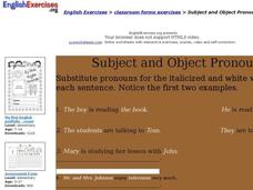 In this ESL subject/object pronouns worksheet, students substitute pronouns for given words in sentences, rewriting accordingly. Page has a link to audio and additional resources.