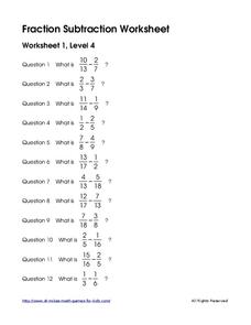 Fraction Subtraction Worksheet: Worksheet 1, Level 1