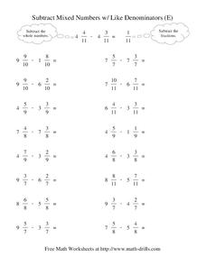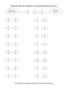 In this fractions learning exercise, students solve 14 problems in which mixed numbers with like denominators are subtracted. An example is provided.