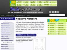 A collection of nine integer worksheets, middle schoolers practice computing the positive and negative values in a variety of problems. Adding, subtracting, multiplying, and dividing integers are the skills conveyed in these resources.