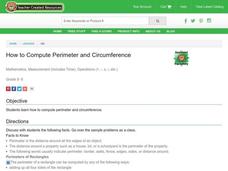 Learners understand the definitions for perimeter and circumference and know the difference. They then go over sample problems as a class. Students use drill and practice skills to complete activity pages.