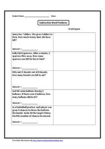 Subtraction word problems are the focus here. Learners are given 15 simple, one-step subtraction problems to solve. Some of them require subtracting money, others use inches and feet, while others use standard numbers. An excellent...
