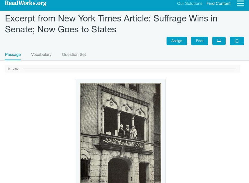 [Free Registration/Login Required] A 1919 news article about the Senate passage of the Susan Anthony Amendment granting women the right to vote. A question sheet is available to help students build skills in reading comprehension.