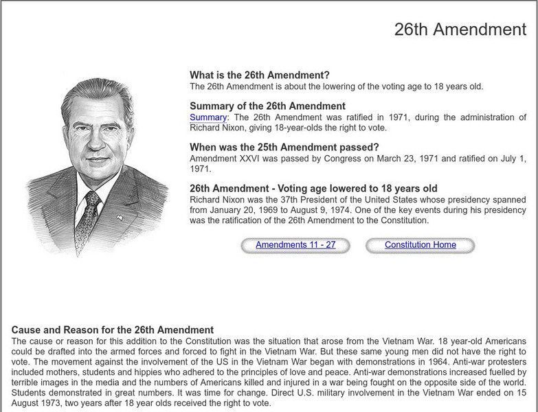 Short, simple summary with the full text of the 26th amendment detailing giving 18-year-olds the right to vote.