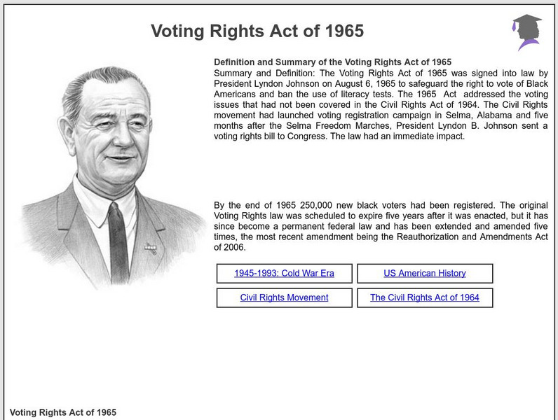 The Voting Rights Act of 1965 was enacted to prevent discrimination and protect voting rights. It was signed into law by President Lyndon Johnson on August 6, 1965, to safeguard the right to vote of Black Americans and ban the use of...