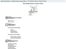 Eighth graders measure height and shadow length of other students on a sunny day and develop a ratio. They apply the ratio to other students and objects using shadows to determine height.