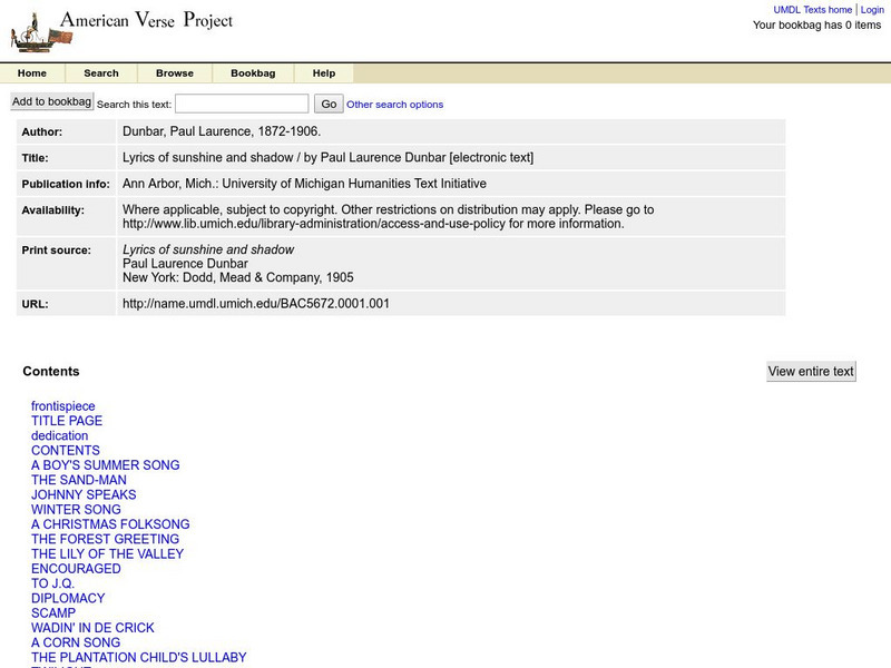 Online text of Paul Laurence Dunbar's "Lyrics of Sunshine and Shadow." Links to each of his texts for easy navigation.