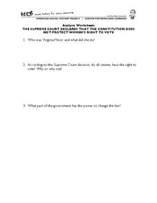 In this voting rights activity, students read instructor-assigned pages about the Supreme Court decision that women did not have the right to vote and then respond to 3 short answer questions.