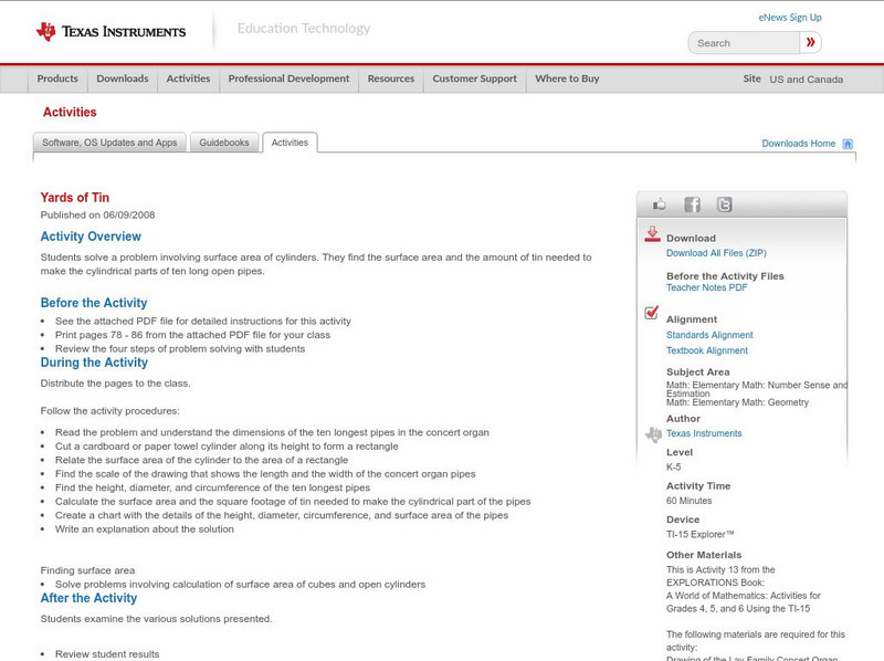 In this activity, students solve a problem involving surface area of cylinders. They find the surface area and the amount of tin needed to make the cylindrical parts of ten long open pipes.