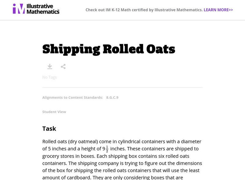 For this task, 8th graders must determine the optimal dimensions of a cardboard box that will hold six cylinders of oats. To do this, they need to make surface area and volume calculations. Aligns with 8.G.C.9.