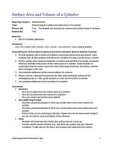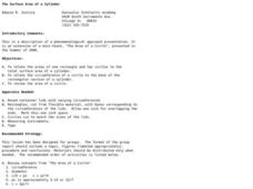 Learners find the circumference and diameter of several circles and calculate the surface area of cylinders. In this surface area of a cylinder lesson plan, students use rectangles and lids to make several cylinders. They calculate the...