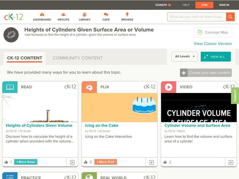 [Free Registration/Login may be required to access all resource tools.] In this lesson students will find the heights of cylinders given surface area and one other dimension. Students examine guided notes, review guided practice, watch...