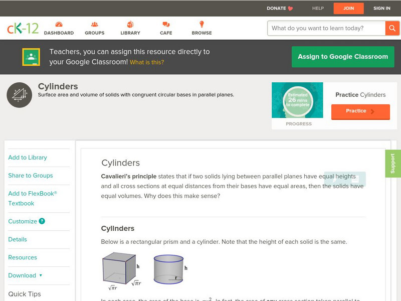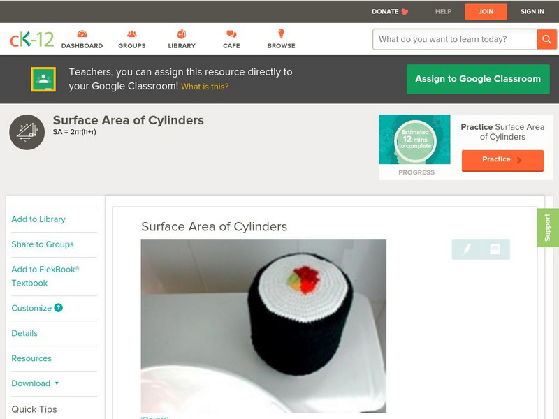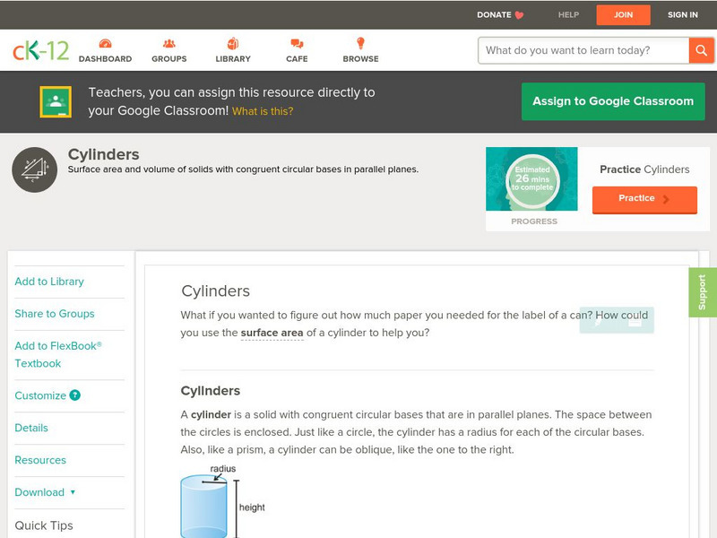 Ck 12: Geometry: Surface Area and Volume of Cylinders